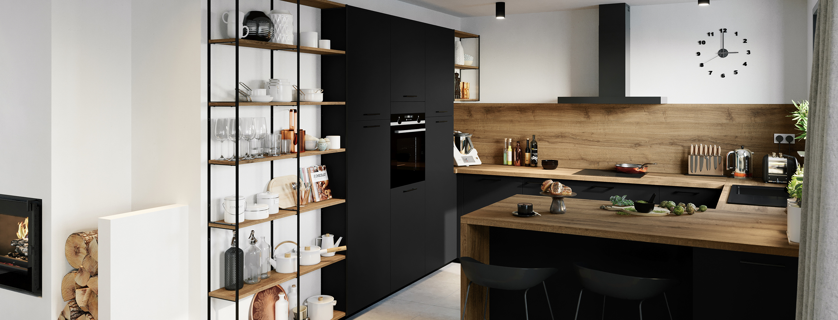 Une cuisine en G, c’est une implantation en U à laquelle on ajoute un retour sous forme de plan de travail, de table ou de bar…La cuisine conviviale par excellence ! Grâce à cette implantation vous disposez d’un espace de 12,7m2.