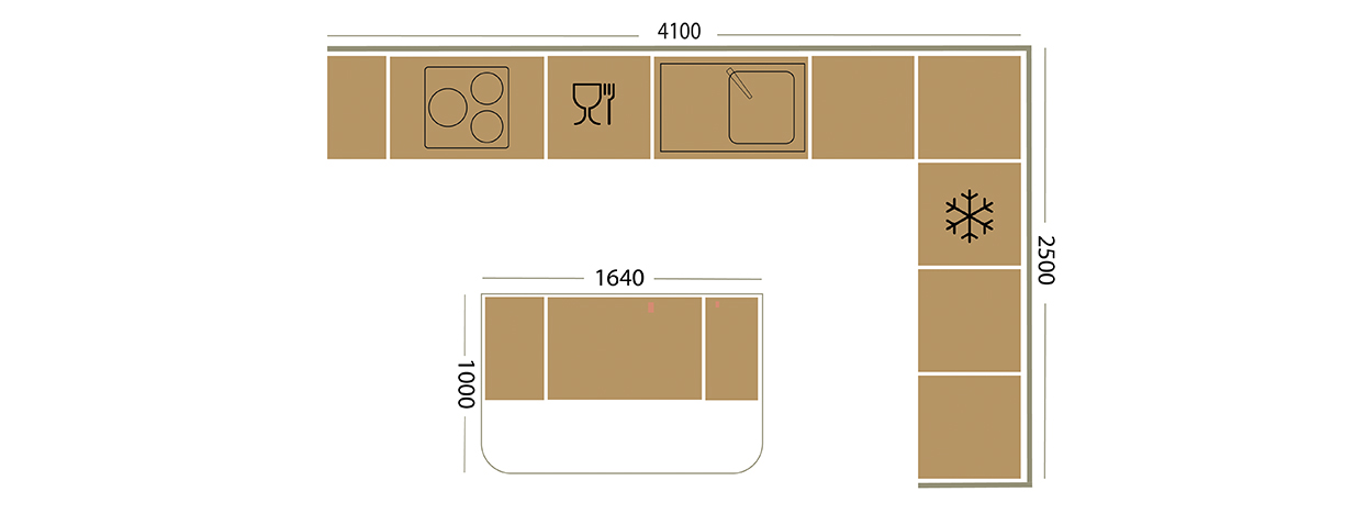 L’implantation en L permet d’optimiser l’espace. Dans cette configuration, un ilôt technique est situé en face d’un linéaire accompagné d’un bloc armoire. Tout pour une conception très pratique au quotidien. Grâce à cette implantation vous disposez d’un espace de 10,25 m2.