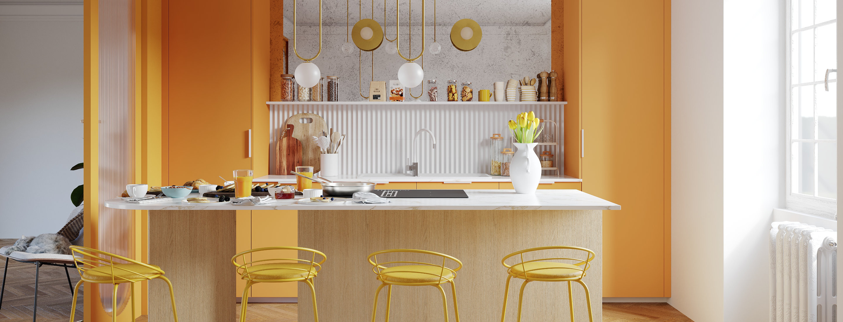 Bouquet Mimosa célèbre la lumière et la convivialité. Sa palette solaire mêle la finition Mimosa Opo des façades et les nuances chaudes du plan de travail Calacatta doré pour une atmosphère joyeuse et élégante