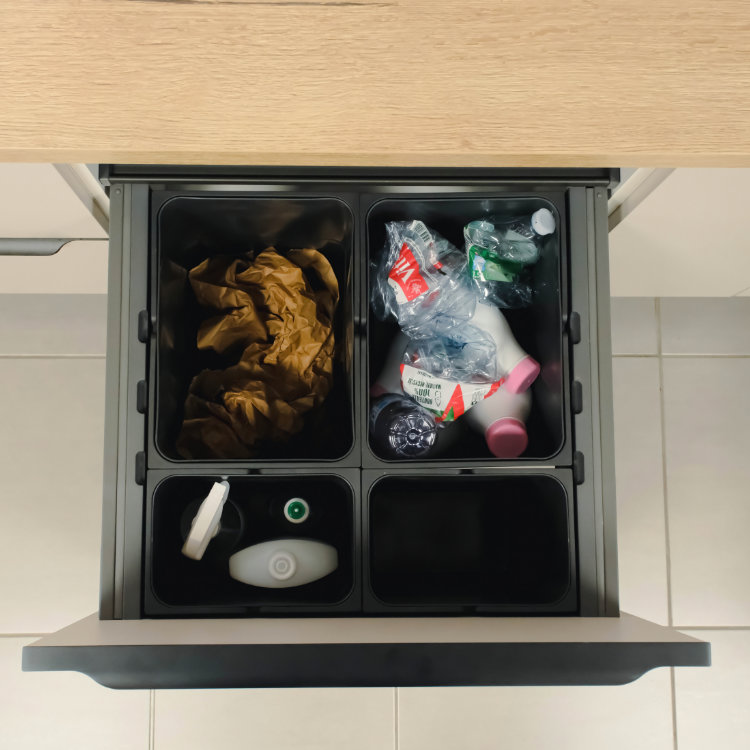 Le tri devient simple avec notre meuble bas qui intègre des poubelle pour un l’espace reste net.