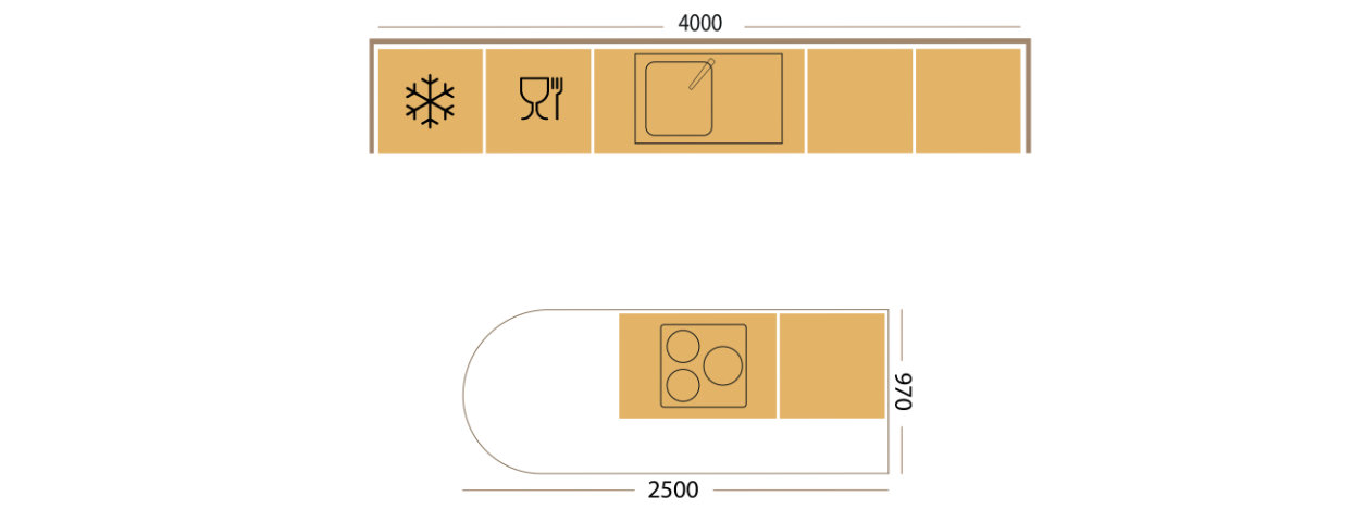 Adaptée à toutes les surfaces, l’implantation en I est la solution idéale. Ce linéaire avec ilôt central permet d’aménager tout ce dont vous avez besoin : le coin repas en plus ! Grâce à cette implantation vous disposez d’un espace de 20 m2.