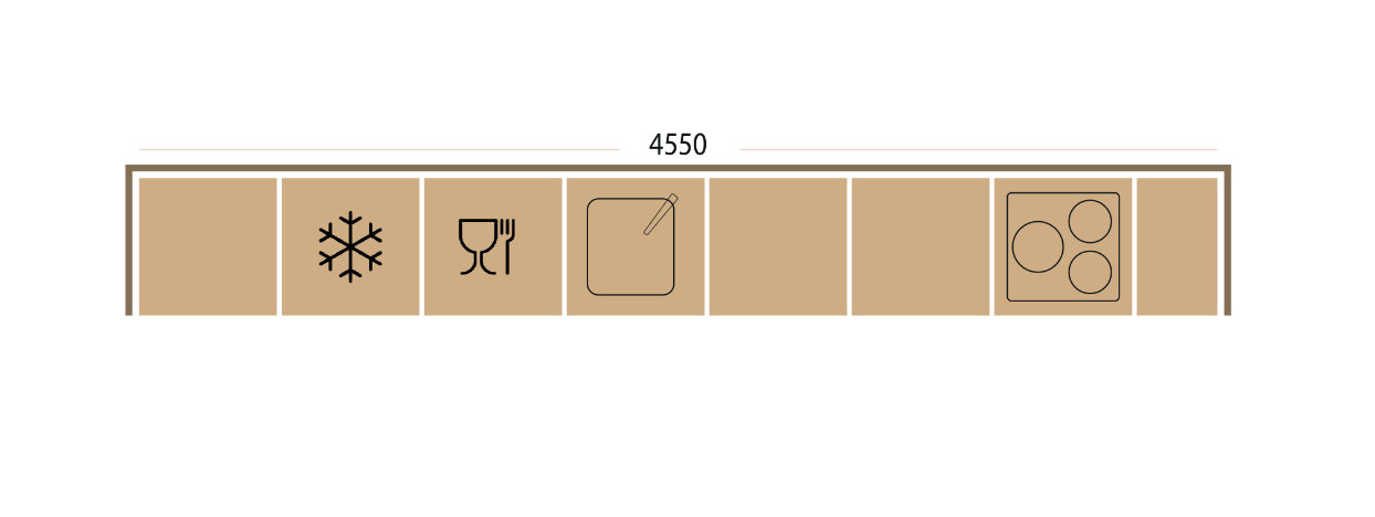 L’implantation en I est la solution idéale pour une cuisine ouverte. Ce linéaire avec ilôt permet d’avoir un plan de travail supplémentaire pour cuisiner. A vous les bons petits plats en famille ! Grâce à cette implantation vous disposez d’un espace de 21 m2.