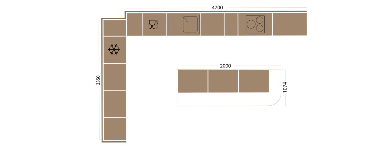 L’implantation en L vous permet de concevoir un espace de vie avec un îlot pour accueillir la famille et les amis et partager un moment convivial. Grâce à cette implantation vous disposez d’un espace de 20m2.