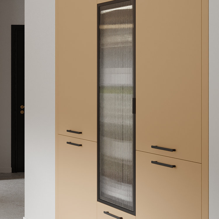 La particularité de cette cuisine repose sur la partie vitrée de la colonne sur-mesure. Elle est un point focal de la pièce, elle allège l’ensemble et met en valeur la vaisselle ou les objets décoratifs.