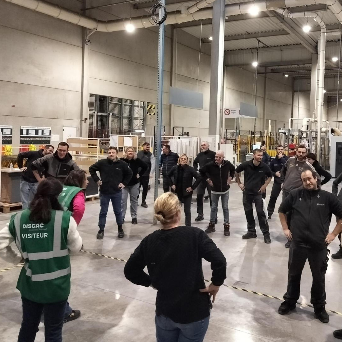 Chaque matin, des séances d’échauffement collectif sont animées sur les lignes de production. Ces moments, devenus rituels, permettent de prévenir les douleurs, de renforcer la vigilance et de créer un vrai temps d’équipe avant le travail.