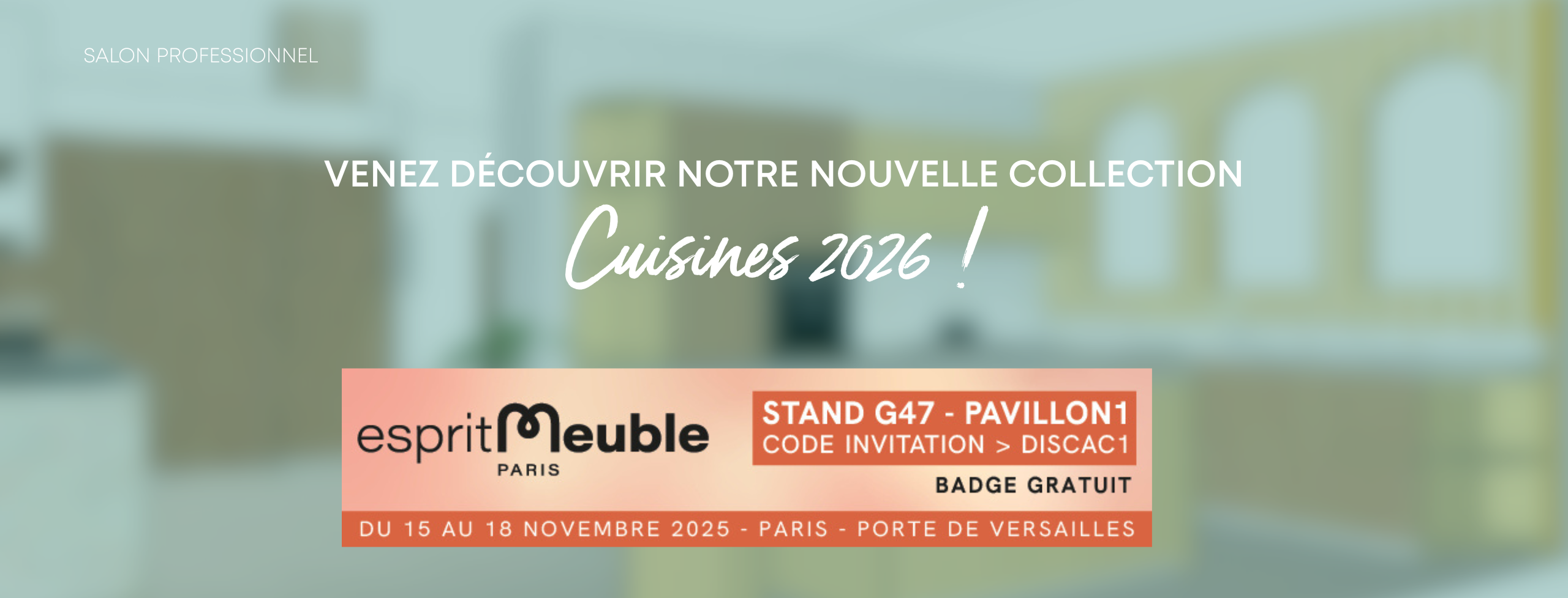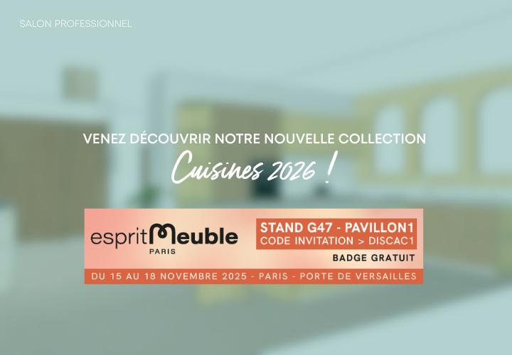 Du 15 au 18 novembre 2025, DISCAC participe à espritMeuble – Paris Porte de Versailles (Hall 1), le grand rendez-vous des acteurs de l’aménagement intérieur. Fabricant français de meubles de cuisines et de salles de bains, nous venons présenter nos nouveautés, mais surtout notre façon de travailler : simple, directe et humaine. Sur notre stand G47, découvrez comment DISCAC transforme la relation fournisseur en une vraie collaboration !